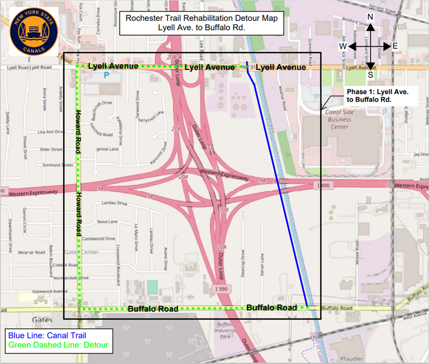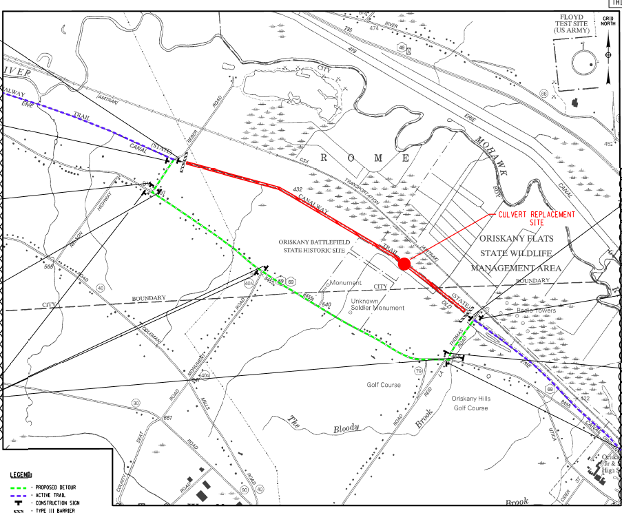 The New York State Canal Corporation will be performing Clearing and Grubbing along fencing, railing, and signage, as well as bollard work along the Erie Canalway Trail in preparation for a Trail restoration project, beginning December 1st. This work is expected to last several weeks and will require a complete closure of the Trail with a marked detour. Please see map below for details.
